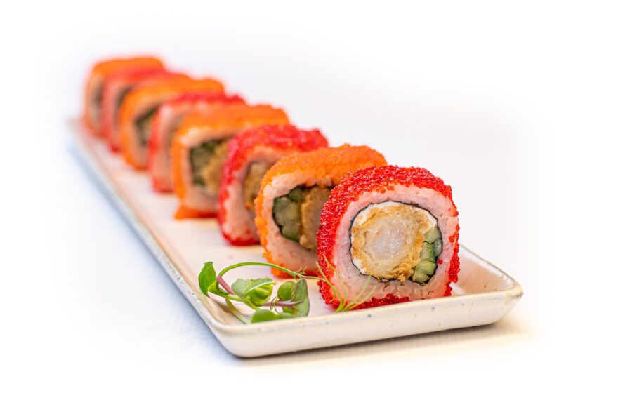SUSHI ESPECIAL. Langostino tempura, tobiko y masago (huevas de pez volador), pepino, queso crema philadelphia, nori y arroz. ALÉRGENOS: Pescado / Crustáceos / Productos lácteos / Huevos / Gluten (8 uds.)