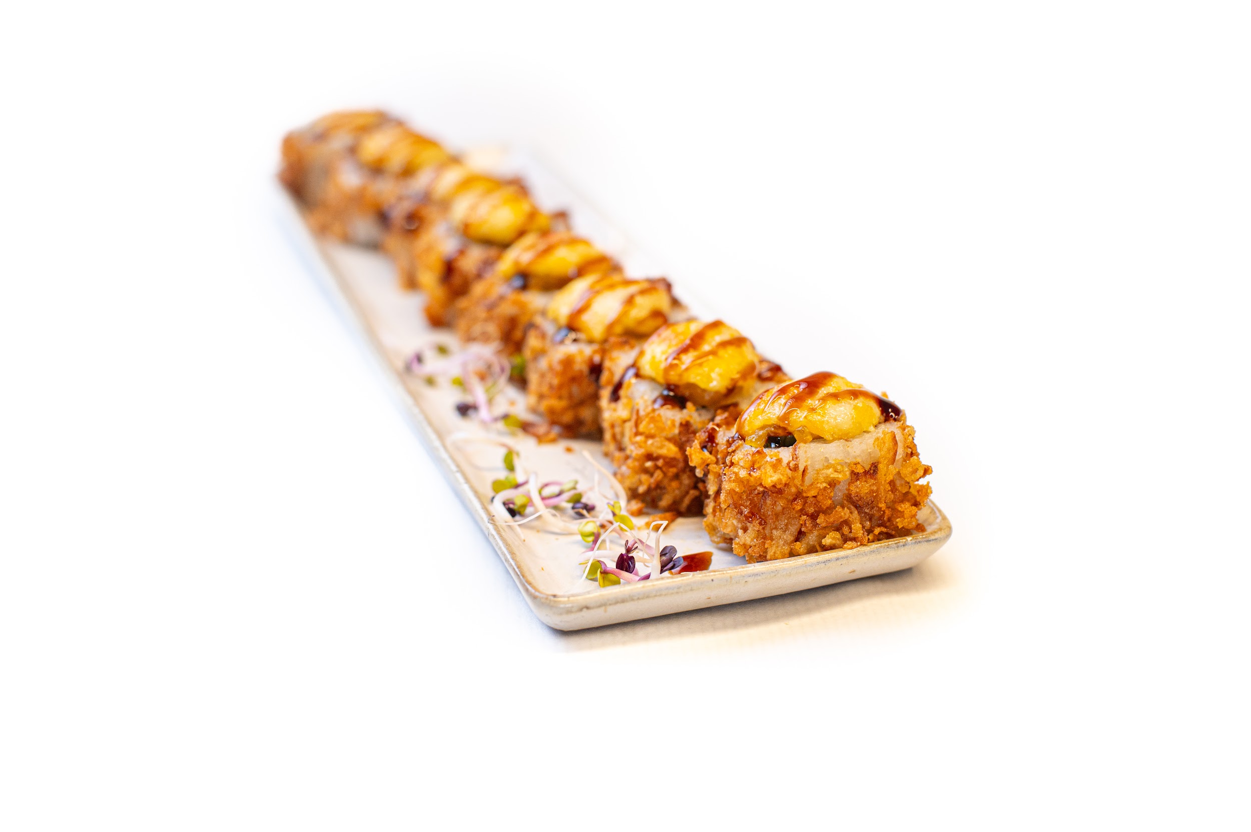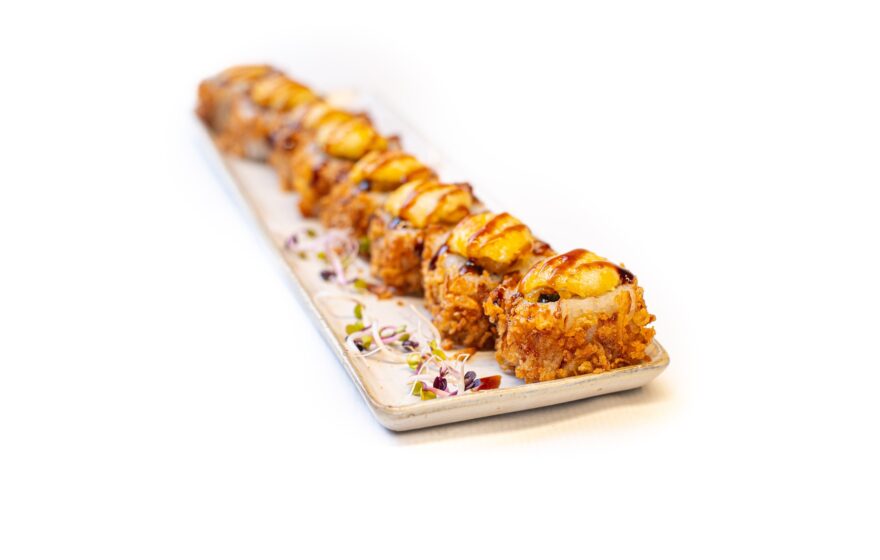 SUSHI CALIENTE. Teriyaki salmón, pepino, queso crema Philadelphia, queso rallado, mayonesa, cebolla asada, nori y arroz. ALÉRGENOS: Pescado / Lácteos / Huevos / Mostaza / Productos de soy / Gluten (8 uds.)