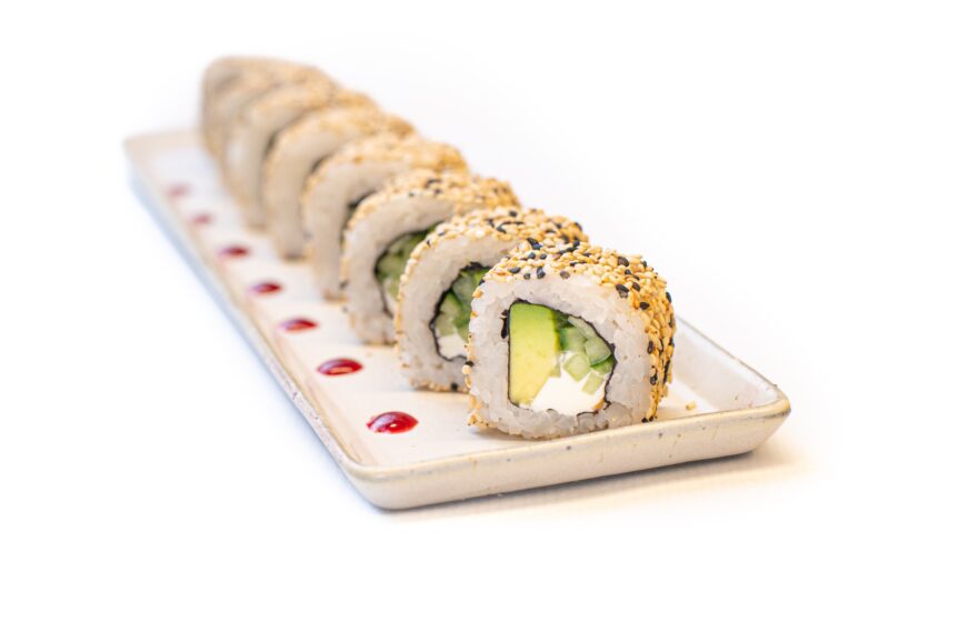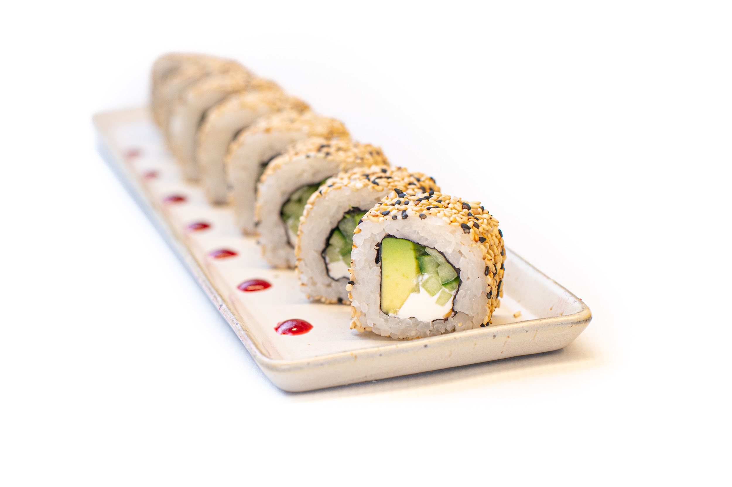 SUSHI ESPECIAL. Aguacate, pepino, queso crema Philadelphia, salsa agridulce de frutos rojos, semillas de sésamo, nori y arroz. ALÉRGENOS!!! Productos lácteos / Semillas de sésamo / Gluten (8 uds.)