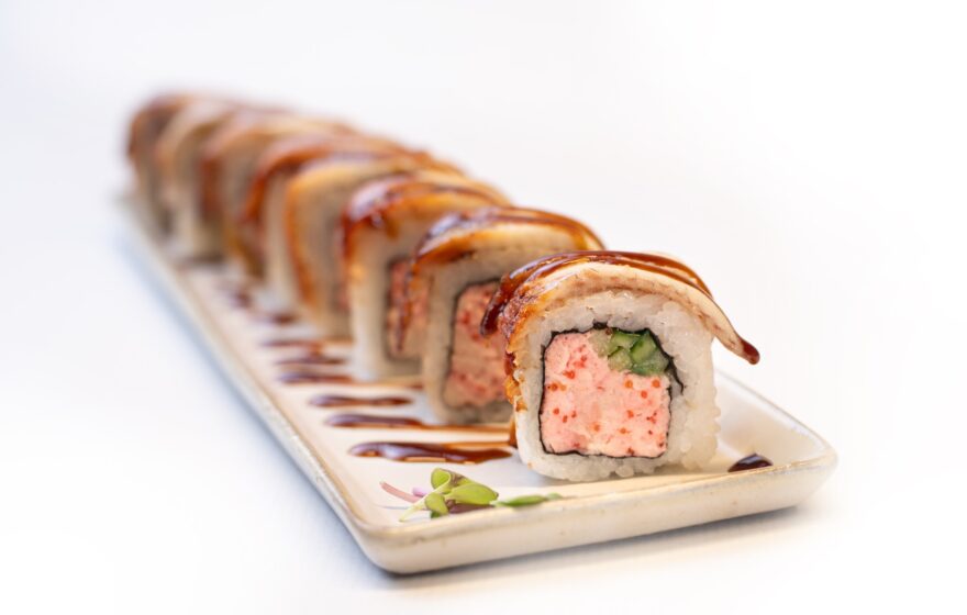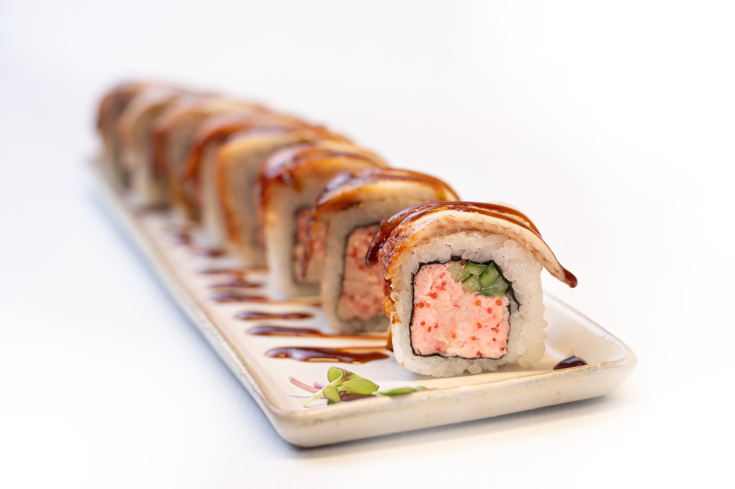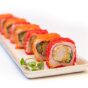 SUSHI ESPECIAL. Anguila, relleno sabor langosta, tobiko (huevas de pez volador), queso crema philadelphia, pepino, mayonesa, semillas de sésamo, nori y arroz. ALÉRGENOS: Pescado / Crustáceos / Productos lácteos / Huevos / Mostaza / Productos de soja / Sésamo / Gluten (8 uds.)