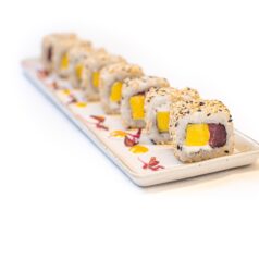 8SUSHI ESPECIAL. Atún rojo, mango, queso crema Philadelphia, semillas de sésamo, nori y arroz. ALÉRGENOS!!! Pescado / Productos lácteos / Semillas de sésamo / Gluten / Productos de soja (8 uds.)